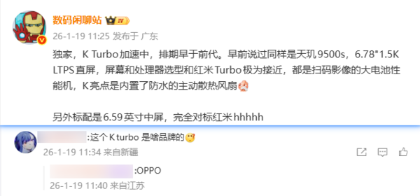 2026年1月,“数码闲道站”又带来了新的音书:OPPOK15Turbo系列将搭载联发科天玑9500s解决器,配备6.78英寸1.5KLTPS直屏。该机还将内置带有防水功能的主动散热电扇,这依然营有望培植手机在高负荷入手时的散热性能,保险手机的雄厚性和畅达性。