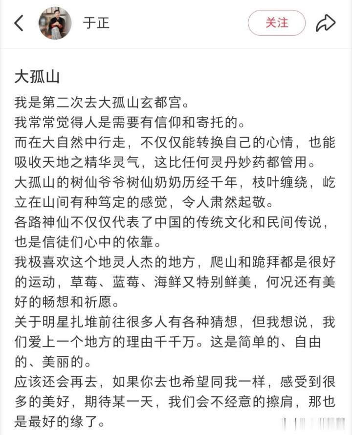 于正回应否认玄学,强调自然人文价值,以两次亲身体验为例,称大孤山地灵人杰,将爬山和跪拜视作很好的运动,盛赞当地草莓、蓝莓和海鲜鲜美。他呼吁公众勿过度解读,表示爱上一个地方的理由千千万,明星行为是简单、自由、美丽的个人选择。