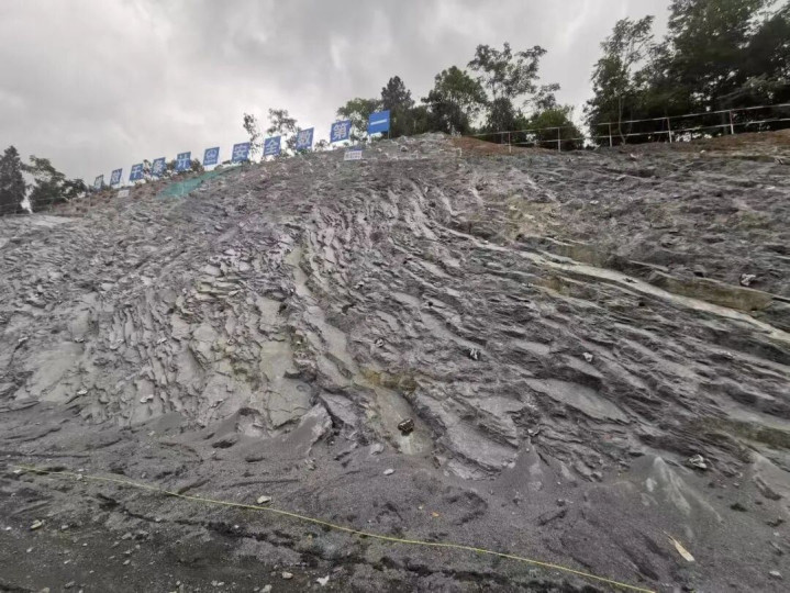 在这样的山体上修路,工程上的“动态设计”一词,便有了格外的重量。每往下挖一层,张磊就要和数智交院从事地质专业的工程师马周一起爬上去,像解读一页被水浸过的古书。敲击岩石的断面,判断风化的程度,测量裂缝的宽窄与走向,推测背后是否有隐伏的构造。