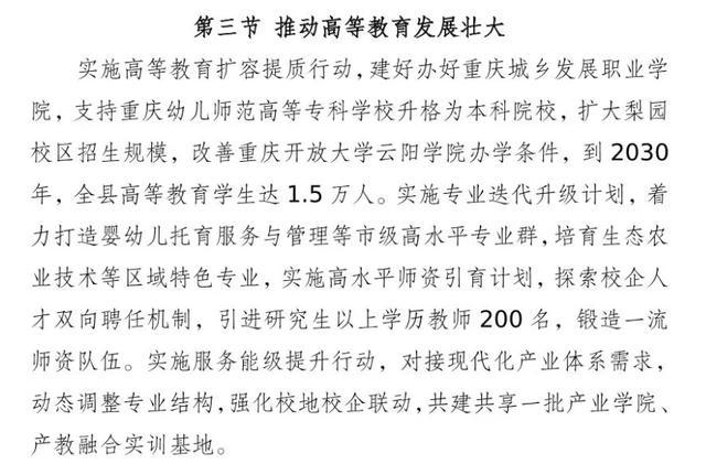 《云阳县国民经济和社会发展第十五个五年谋划摘抄》明确暴戾“推行高档教师扩容提质活动,建好办好重庆城乡发展处事学院,支合手重庆幼儿师范高档专科学校升格为本科院校,扩大戏班校区招生范围,改善重庆开放大学云阳学院办学要求,到2030年,全县高档教师学生达1.5万东谈主。”