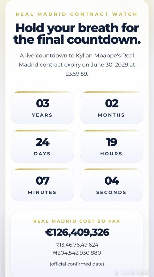 皇马球迷特等作念了一个网站,及时倒计时姆巴佩与皇马的契约到期时候(2029年6月30日23:59:59)以及破耗资本