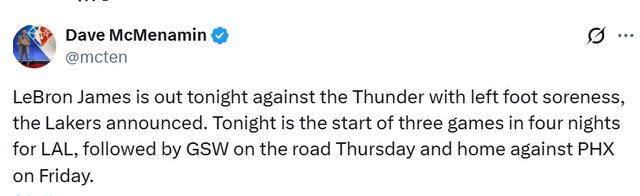 41岁的詹姆斯本赛季左脚一直存在不适。上周东契奇(左腿筋)与里夫斯(左斜肌)遇到重伤后,詹姆斯在湖东说念主128-134不敌独行侠的比赛中承担了更重的出场任务,出战39分钟砍下30分15助攻9篮板,赛后球队对他的伤势进行管控,球队在季后赛前对詹姆斯采选严慎保护计策,完全不错泄漏。