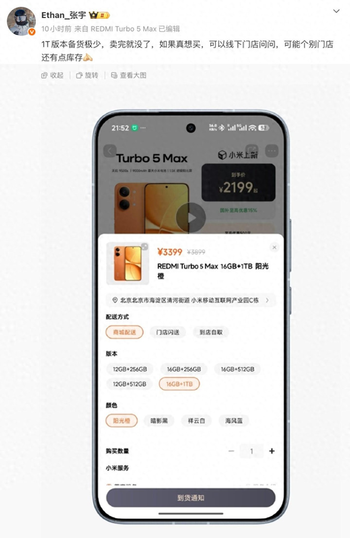 REDMI Turbo 5 Max的1TB版,小米商城早卖光了,线下店也只剩稀薄几台,问客服就说“没货,不补”。张宇晚上发话挺果真:“备货少,卖完真没了”,不是吊胃口,是真作念不起。